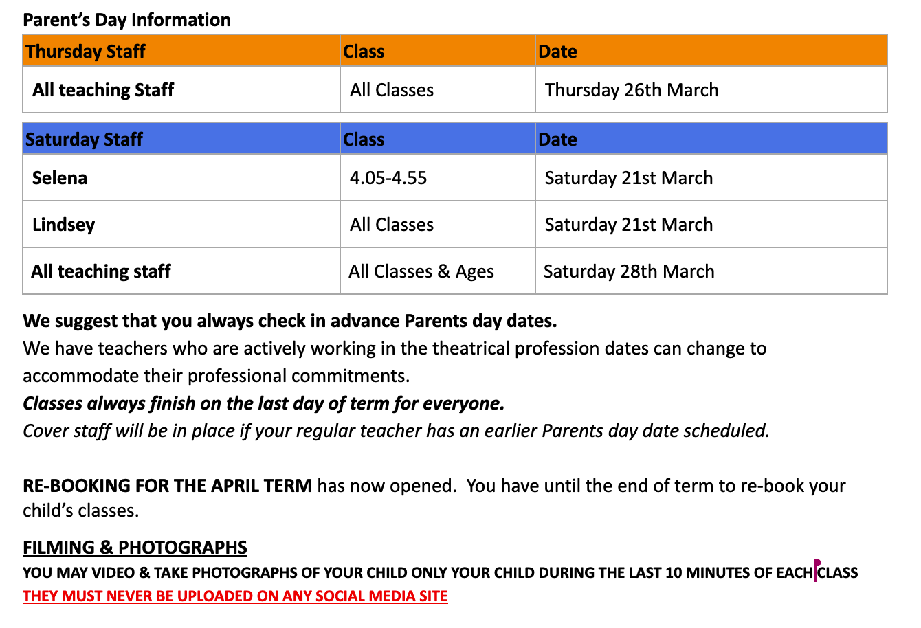 Please check nearer the time to confirm staff and your child's viewing day.